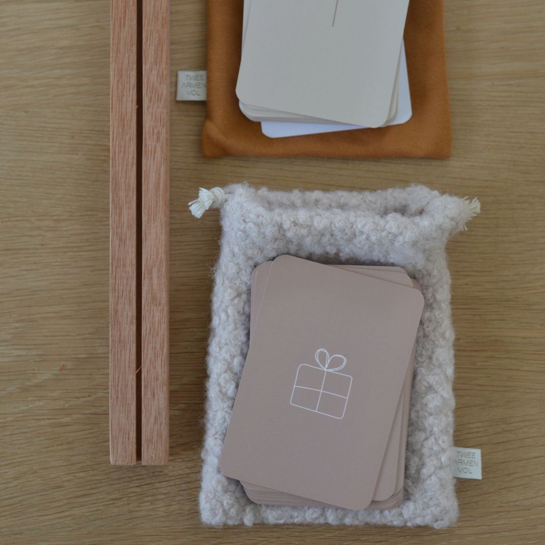 Deze aftelset bevat de Cijferkaarten + de Feestdagen kaarten. Het grote voordeel: je krijgt er tijdelijk gratis een kleine houder bij. Zolang de voorraad strekt! Een duurzaam alternatief voor de aftelkalender.